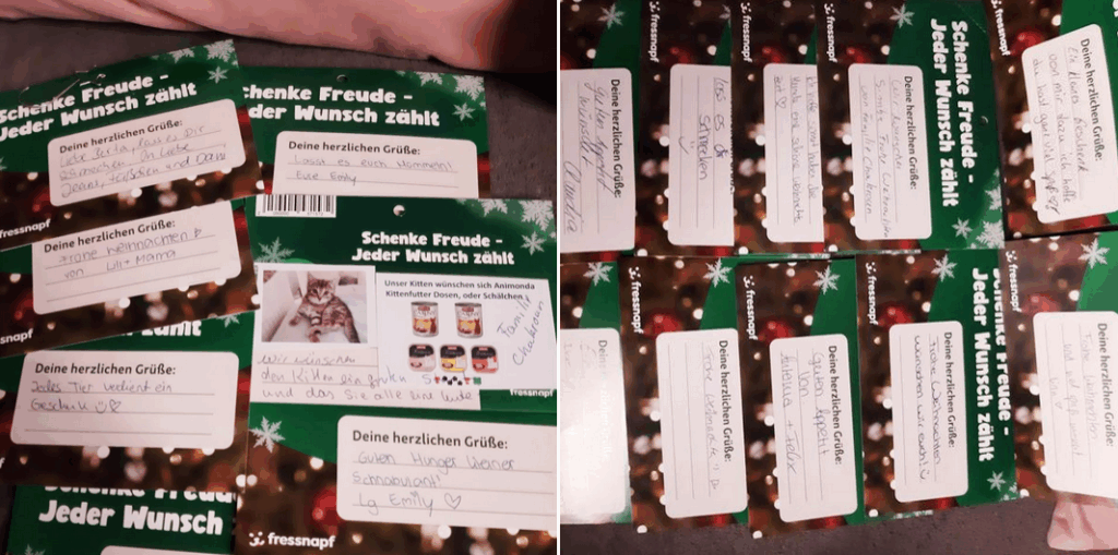 Noch vor dem ersten Advent konnten wir in den Fressnapf-Märkten mehrmals großartige Spenden abholen. Gutes und schmackhaftes Futter für Hunde und Katzen, Spielzeuge, Kissen – einfach alles, was das Herz unserer tierischen Freunde höherschlagen lässt.