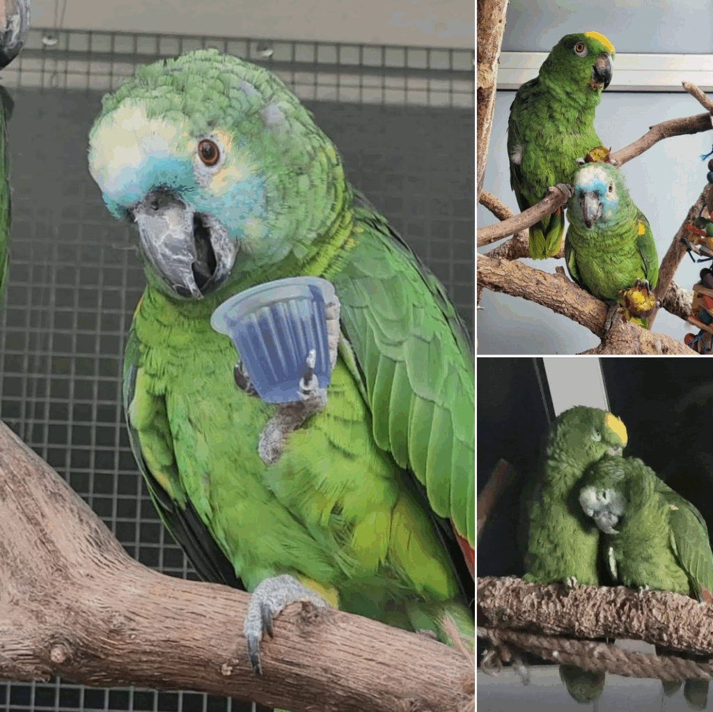 Zusätzlich zu ihrer herausfordernden Persönlichkeit litt Kia an Aspergillose und wurde positiv auf Papillomaviren getestet. Intensive Behandlungen mit Medikamenten, Inhalationen und Besuchen bei spezialisierten Tierärzten folgten, doch trotz aller Bemühungen wurde sie nie vollständig gesund. Um ihr Gesellschaft zu geben, zog Max ein, ein Papagei, der ebenfalls viele Jahre allein gelebt hatte. Was niemand erwartet hätte: Die beiden wurden tatsächlich ein Paar – ein kleines Wunder nach so vielen Jahren in Einzelhaltung. Damit wurde einmal mehr deutlich, wie wichtig es ist, solche Vögel nicht allein zu halten.