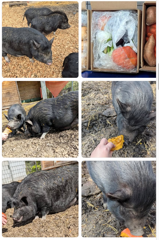 Zum Beispiel könnten wir einmal im Monat eine Lieferung aufgeben. Jede Lieferung könnte dann auch eine sogenannte „Retterkiste“ mit leicht angeschlagenem Gemüse enthalten – was die Tiere natürlich überhaupt nicht stört.